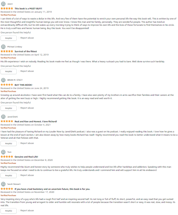 Not all stories that start sadly end that way... Richard shows a true warrior spirit in kicking his addictions and turning his life around. Found out some new things about the author whom I know, and now have more respect for this man I’m proud to call a friend.
